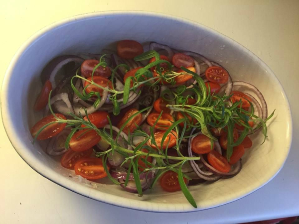 Skjær opp en rødløk i skiver. Skjær tomater i to fra en halv boks med cherrytomater.
